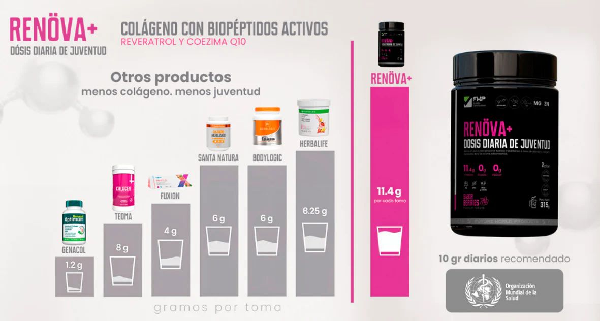 Con RENÖVA+ ¡es posible! Este suplemento premium combina colágeno hidrolizado, resveratrol y Coenzima Q10 para ofrecerte beneficios que se sienten y se ven 🍇